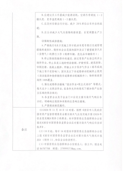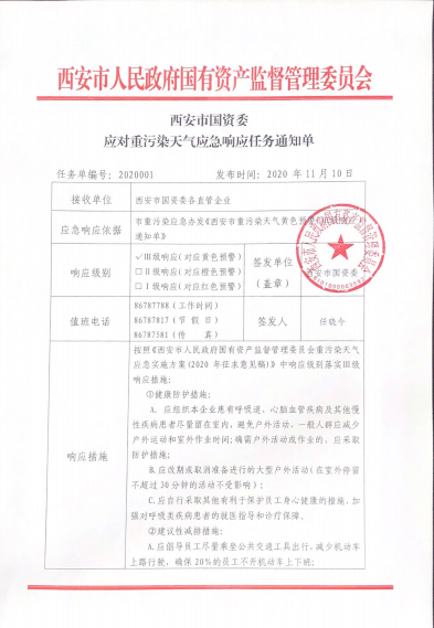 關于西安市國資委應對重污染天氣應急響應任務通知(編號:2020001)的要求,請公司各部門及子公司員工明確響應級別,做好個人健康及節(jié)能減排相應措施。